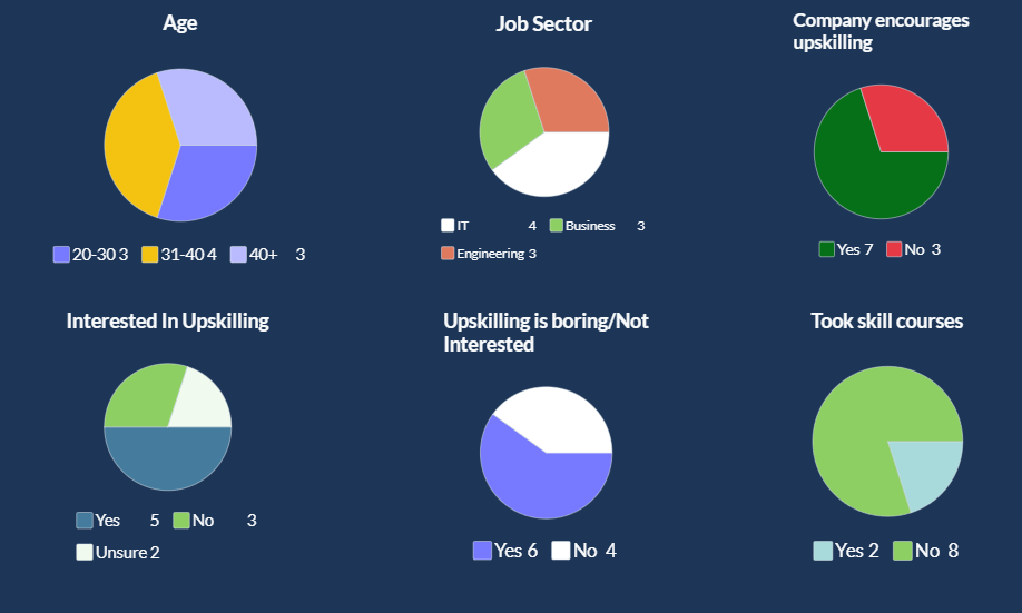 I followed two research methods i.e Quantitative and Qualitative analysis. In the qualitative analysis, I have interviewed 10 people who are currently working to understand what they find out what are their thoughts on upskilling. In the quantitative analysis, I have taken a survey of 10 people.